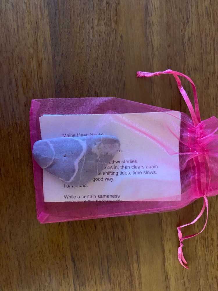 We collected heart rocks all up and down the Maine coast the summer of 2020. Knowing I was soon facing a mitral valve repair, it seemed the thing to do. By the end of the summer we had quite a collection and I decided to gift them along with a poem I wrote to the medical folks who helped me. I gave the unusual one photographed above to Miki my friend, neighbor, and PCP. It was she who told me just over a year ago that my heart sounded “different”, and launched me on a journey to safety.